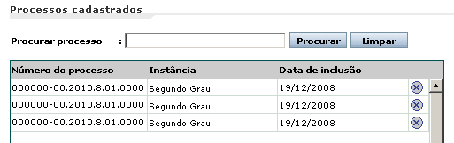 O processo será incluído na tabela 'Processos cadastrados'.
