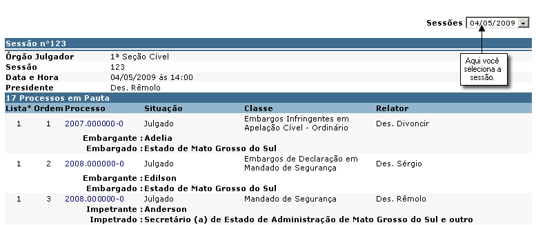 O sistema listará de maneira resumida os julgamentos da última sessão. Para pesquisar uma outra data, faça a alteração no campo <Sessões>.