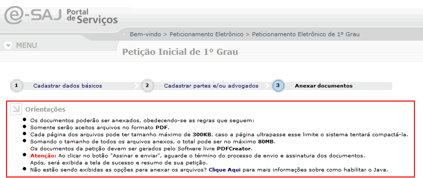 O tamanho máximo dos arquivos a serem anexados e enviados irá depender das configurações disponíveis para cada cliente. Para ter acesso às informações referente ao tamanho máximo dos arquivos, siga as orientações presentes na etapa 3, Anexar documentos, da tela Peticionamento Inicial de 1º grau ou Petição Intermediária de 2º grau. Veja a imagem como exemplo.